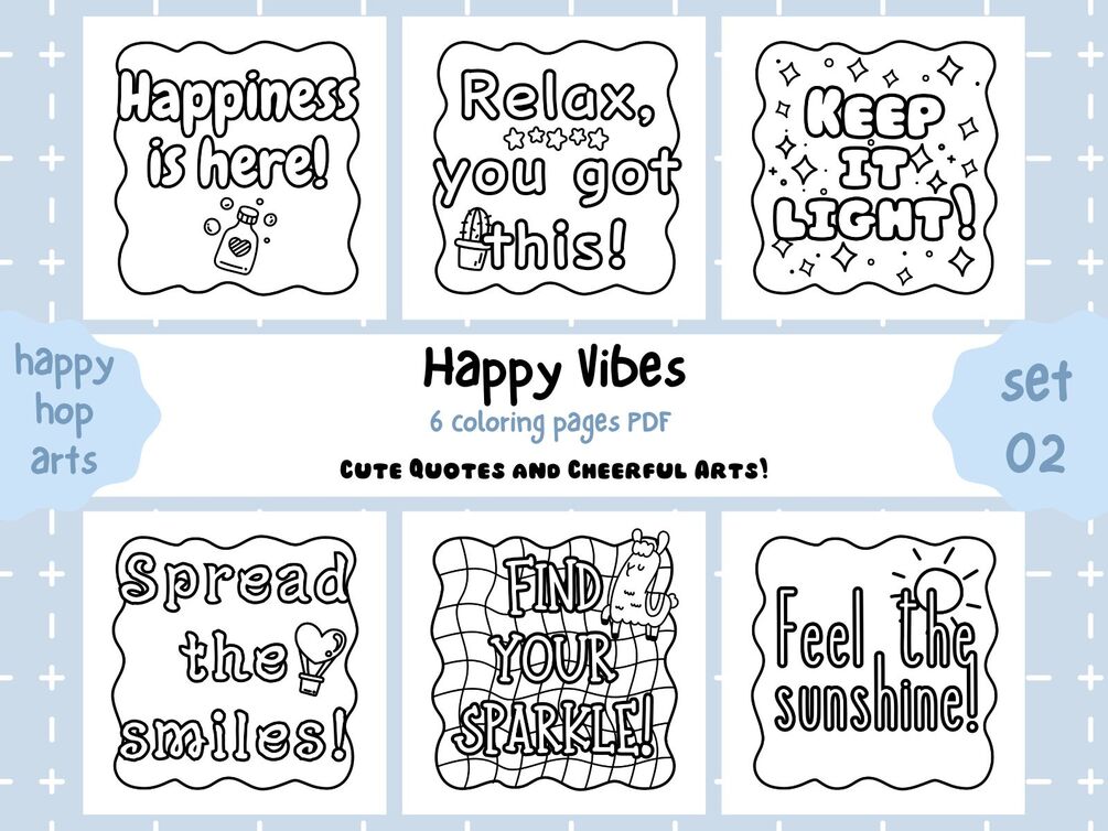 HappyHop: Happy Vibes (Cute Quotes & Cheerful Arts) Coloring 6 Pages PDF | Set 02