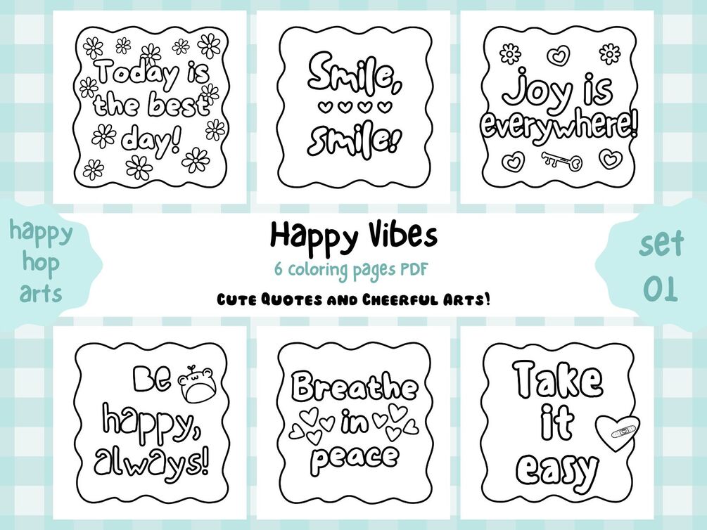 HappyHop: Happy Vibes (Cute Quotes & Cheerful Arts) Coloring 6 Pages PDF | Set 01